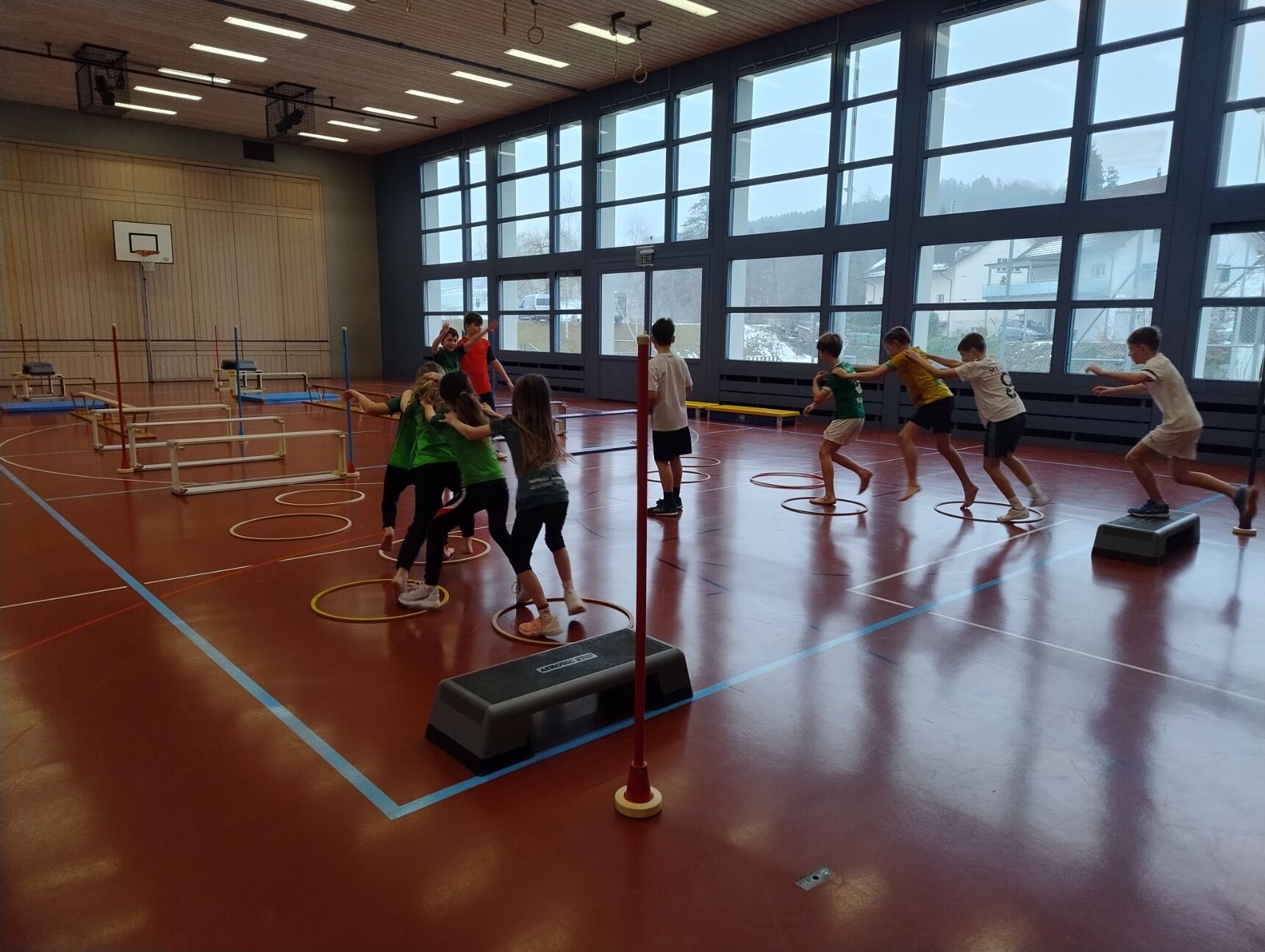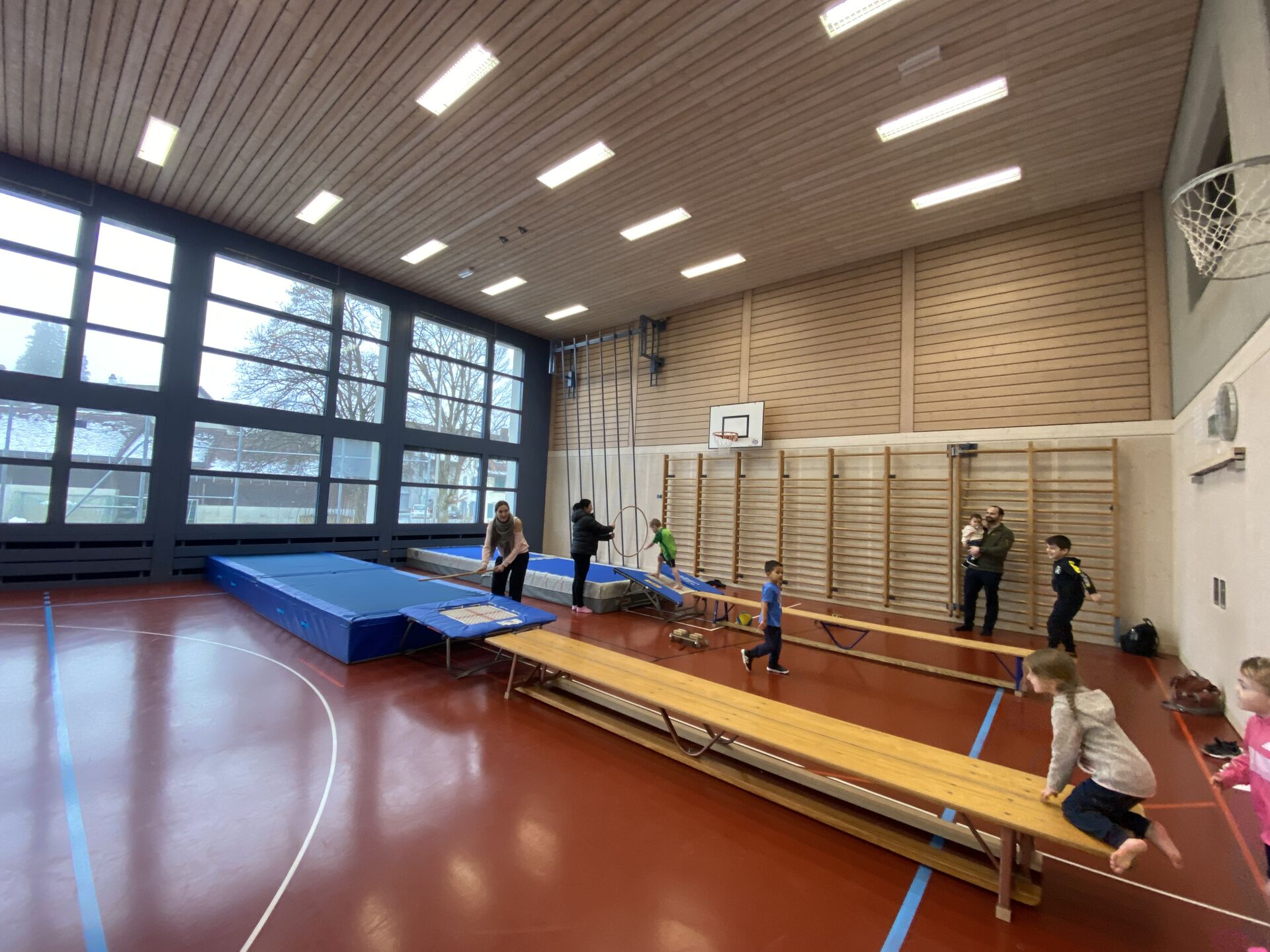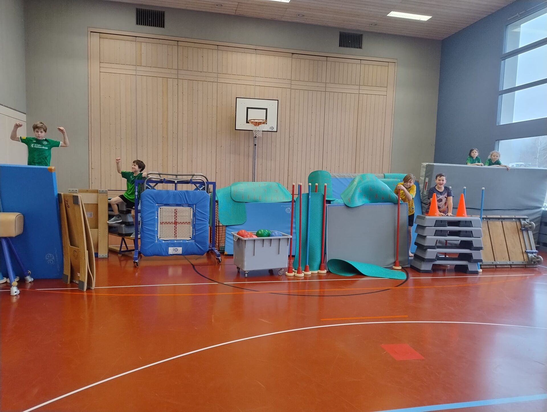 Der Wunsch nach einem Turnhallensonntag wurde ans ELFO herangetragen. Dieses Angebot für Schülerinnen und Schüler aus Hauptwil gab es vor Jahren schon einige Male, somit waren wir gespannt auf welches Interesse der Turnhallensonntag vom 18. Januar 2026 stösst. Am Vormittag waren alle Kindergartenkinder bis und mit zweiter Klasse eingeladen in die Turnhalle zu kommen, um zu spielen und zu turnen. Die Ringe wurden bereits vor dem Start hinuntergelassen und die dicken Matten unter der Sprossenwand deponiert, somit war das Programm nach dem Aufwärm-Fangis schon klar. Die 14 Kinder turnten, schaukelten und zeigten ihre Kunststücke an den Ringen, während einige lieber hoch hinauskletterten. Die Ring- Riesenschaukel war sehr beliebt und wurde von allen getestet. Als alle an der Reihe waren, wurde das Material wieder versorgt und die Kinder wählten Trampolinspringen und Fussball als nächstes aus. Der Fussball wich nach einer Weile den Unihockeyschlägern und auf dem Minitrampolin zeigten viele Kinder ihr Können. Dazwischen konnten sich die Kinder bei Äpfeln, Tessiner Brot und etwas Schokolade stärken, einige hatten kaum Zeit zum Essen und waren zack schon wieder in der Turnhalle. Beim abschliessenden «Omeletten- Fangis» bekamen alle nochmals so richtig warm und wir konnten nach kurzweiligen 2 Stunden bestgelaunte Kinder verabschieden.
