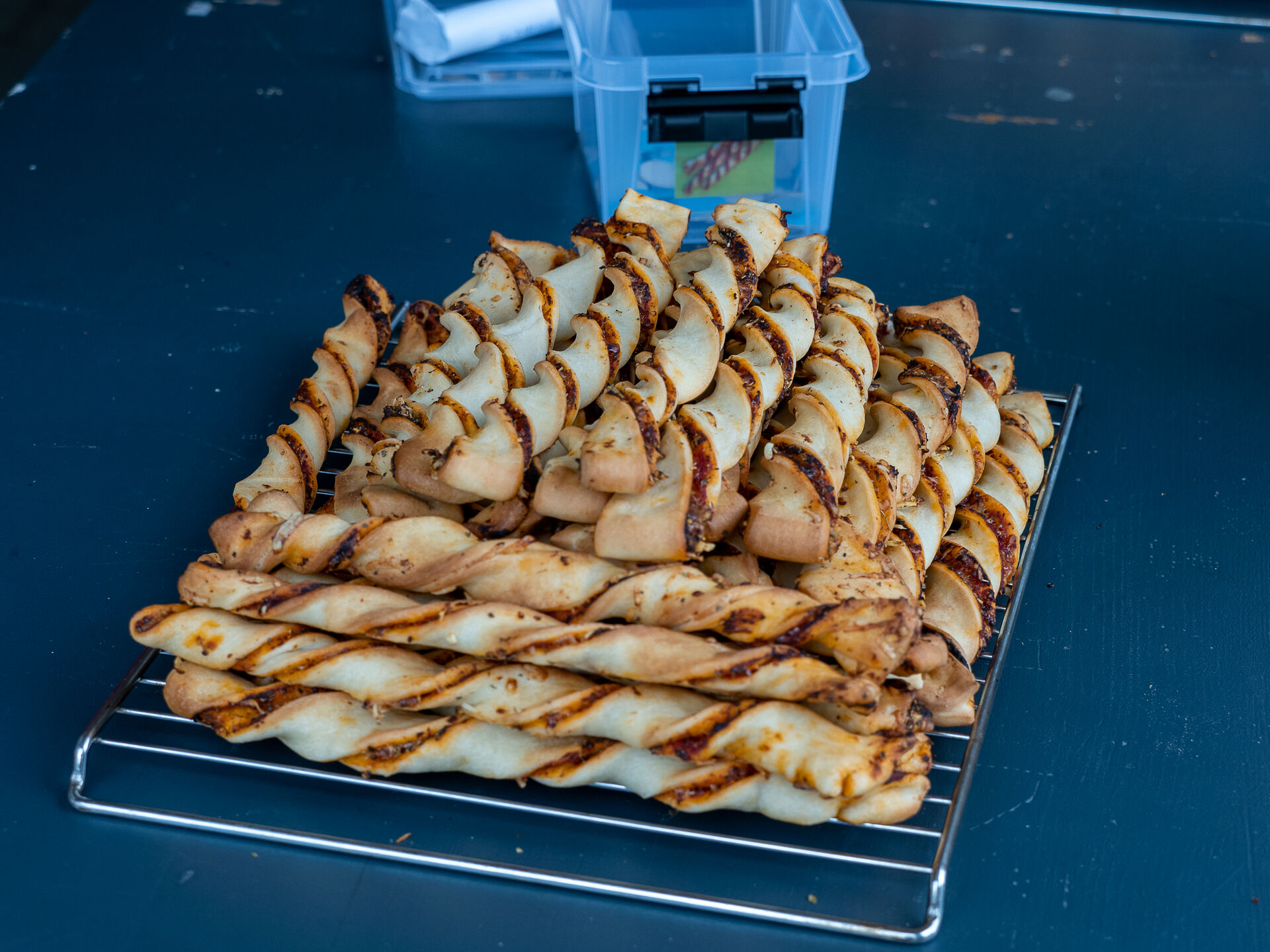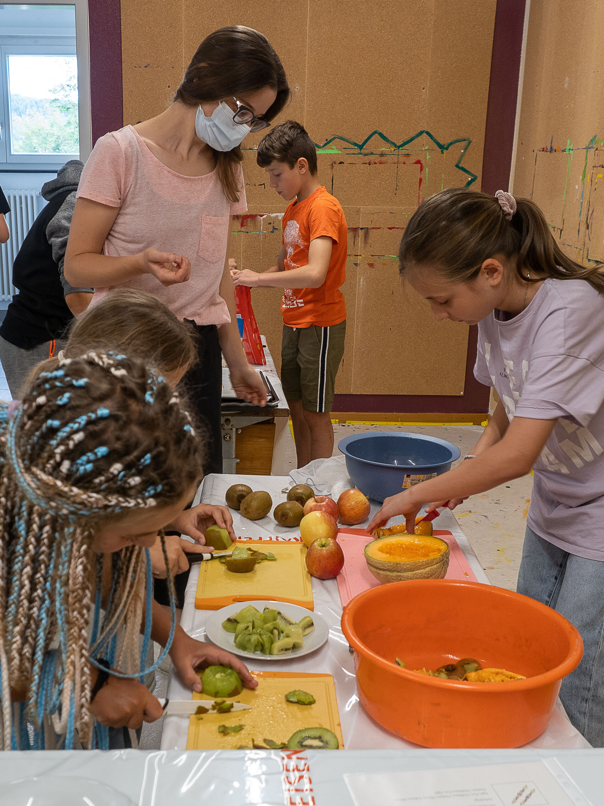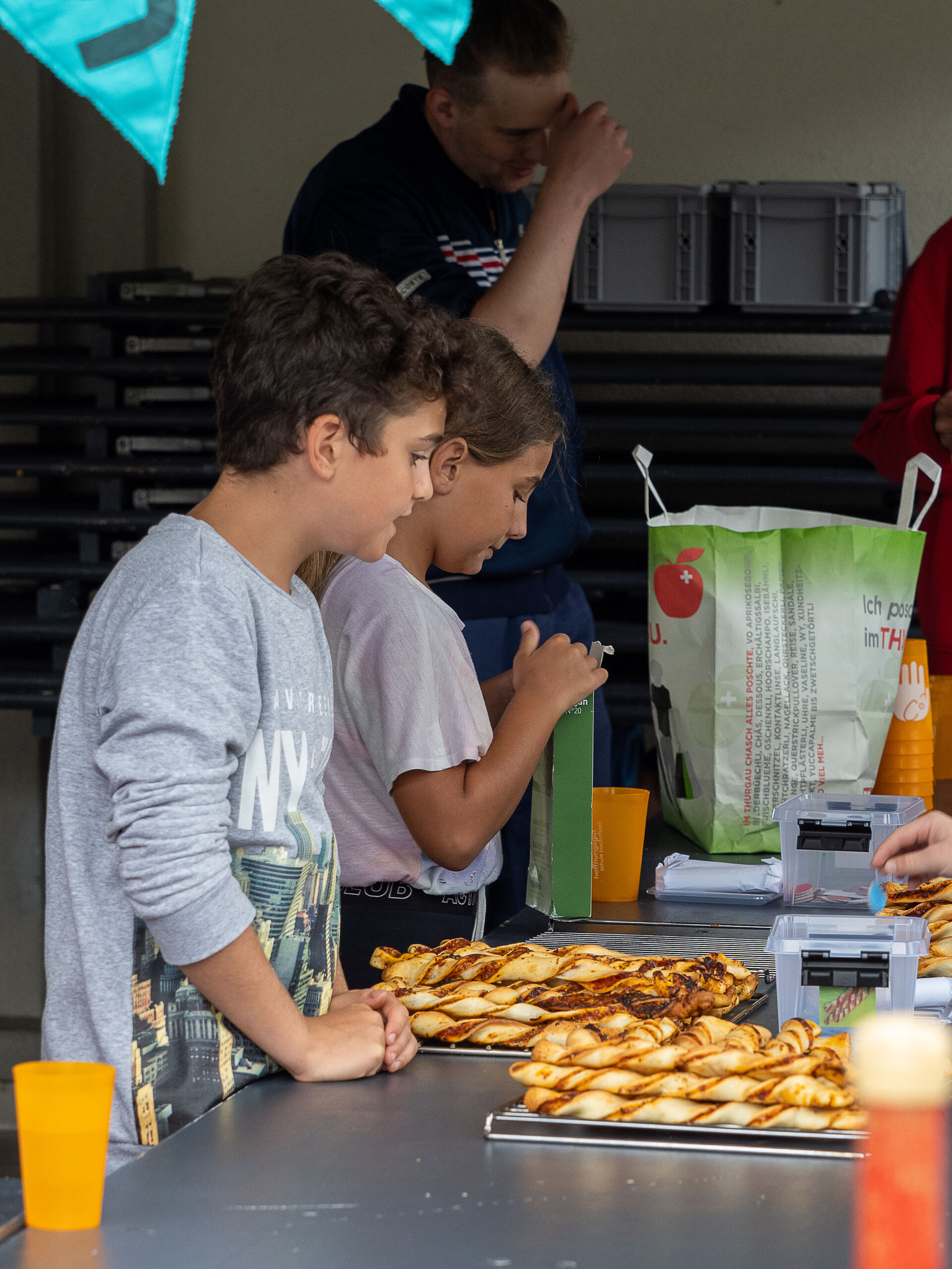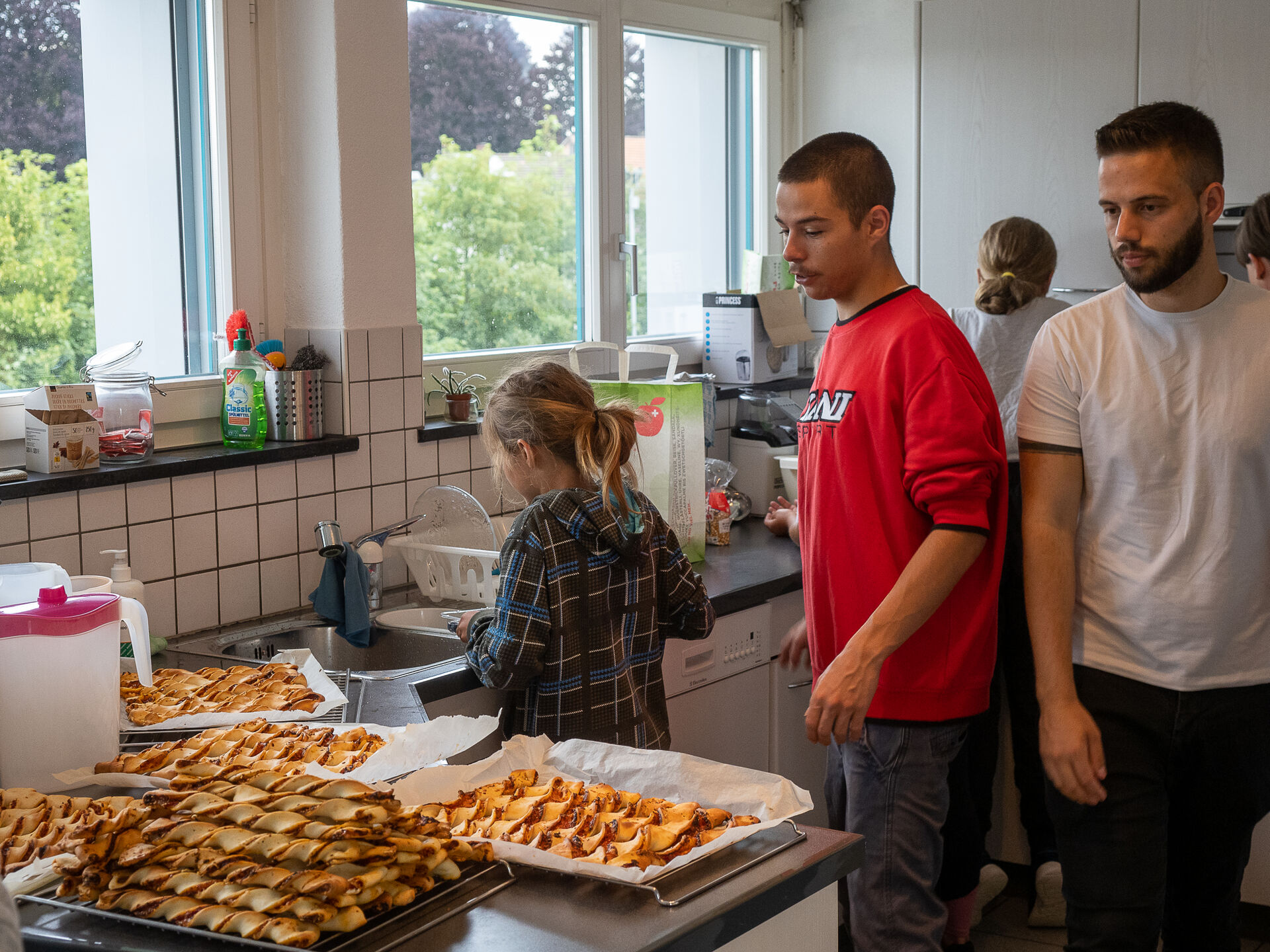 Zehn Schüler/innen aus allen 4. Klassen halfen mit, die Pausenkiosk-Köstlichkeiten in der alten Hauswartküche zuzubreiten. Im Angebot waren Pizzastangen, Früchtespiesse, Bürli mit Frischquark und Popcorn. Dank dem cleveren Bestellsystem am Vortag wusste das Pausenkiosk-Team, wieviel wovon hergestellt werden musste. Aber bei über 80 bestellten Pizzastangen reichte die Ofenkapazität nur dank initiativem Vorausbacken der Studierenden.