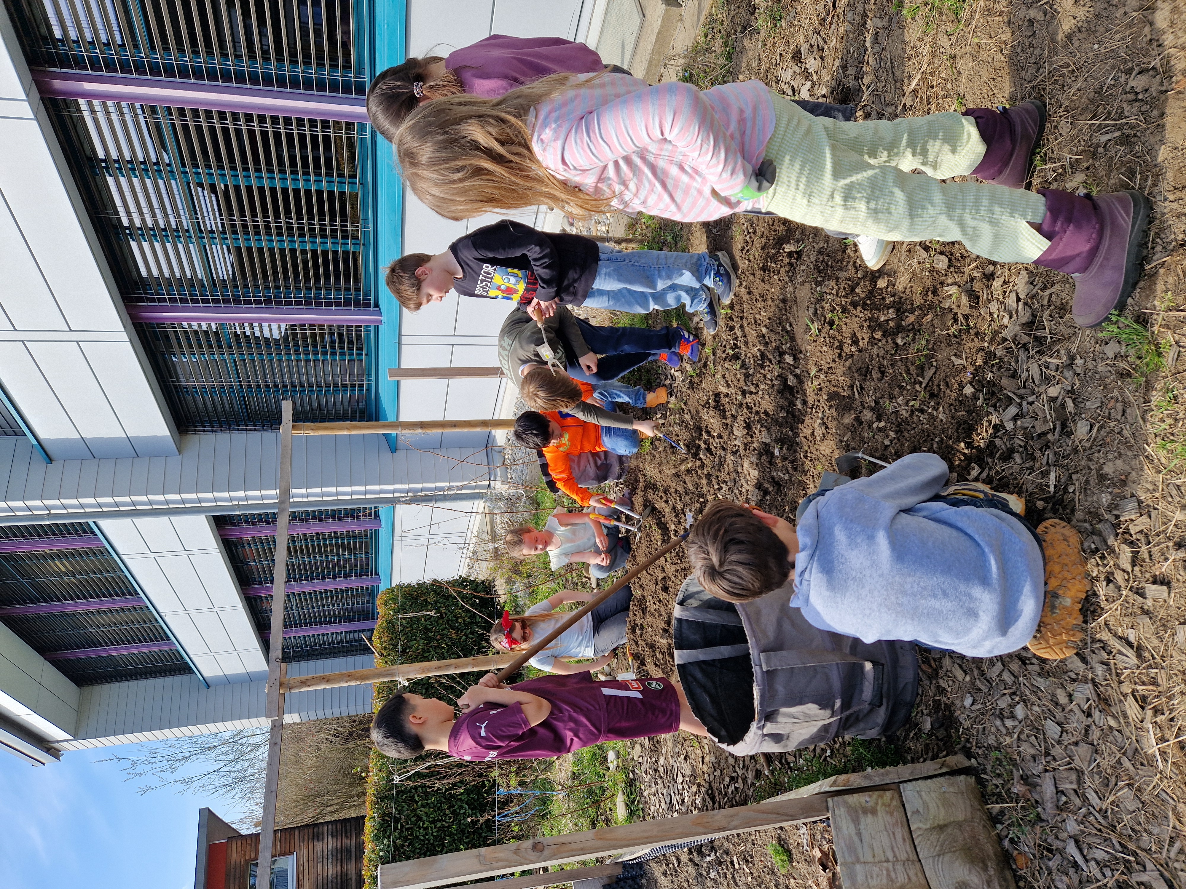 Mit den milderen Temperaturen und dem schönen Wetter zieht es die Klasse Schönenberger nach draussen in den Schulgarten. Es ist Zeit, den Garten für den Frühling startklar zu machen. Die Beete werden gejätet, die Erde wird gelockert und Rosmarin- und Lavendelsträucher schneiden wir zurück. Das ist eine ideale Gelegenheit, um den richtigen Umgang mit Gartenwerkzeugen kennenzulernen und Pläne zu schmieden, was wir anpflanzen möchten.