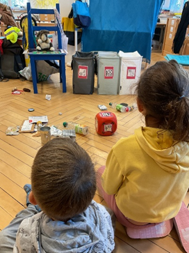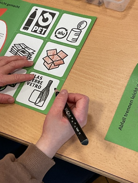 Am Mittwoch, 19. November 2025 besuchte uns Herr Anmacher von Pusch. Zusammen schauten wir, wie man Abfall trennt. Wir lösten ein Abfallpuzzle, versuchten in der Tastkiste zwei gleiche Materialien zu finden, warfen Abfall in den richtigen Container und malten die Abfallsymbole aus.