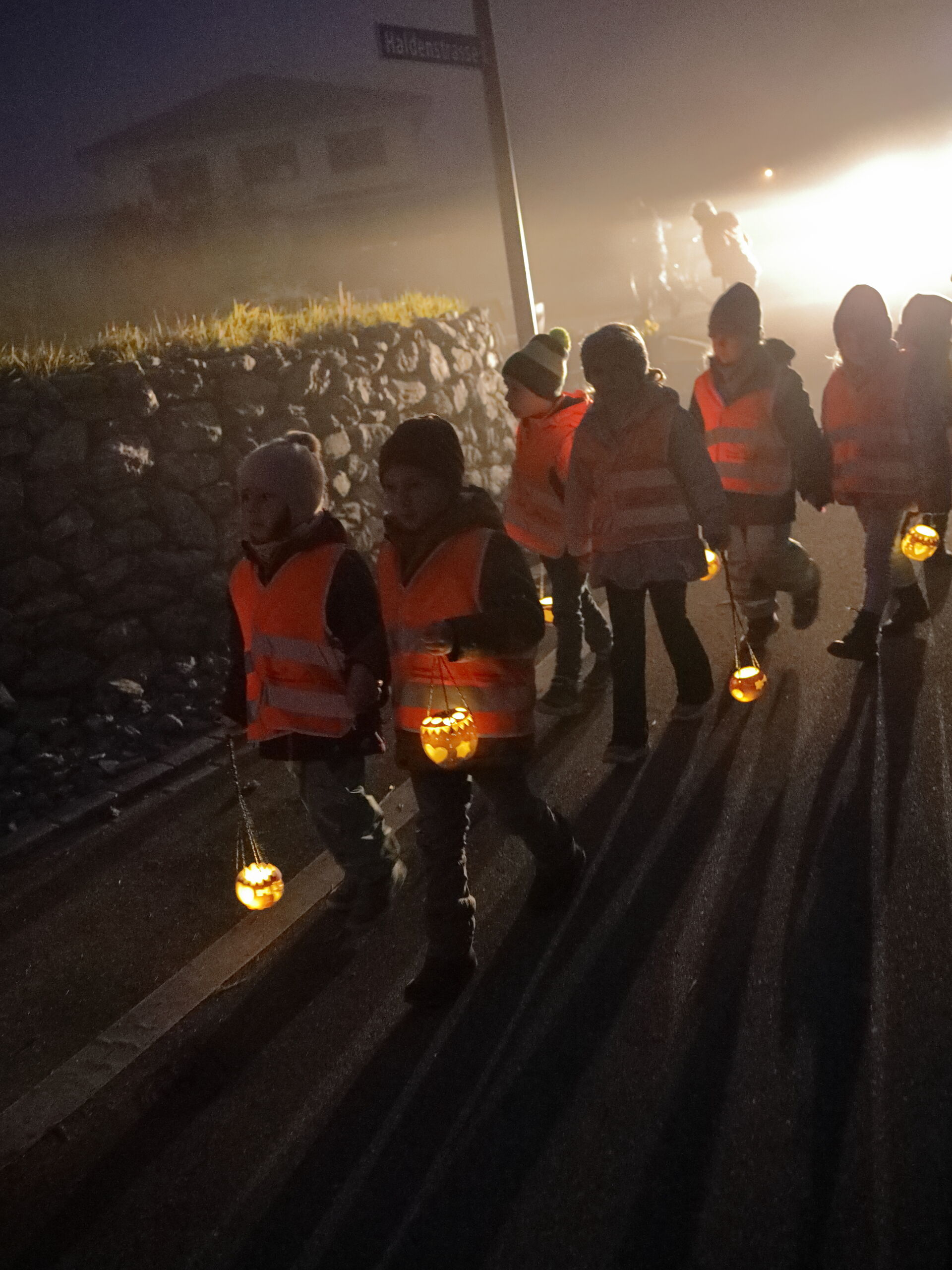 Der Umzug am Abend begann stimmungsvoll im Kleinsaal, wo alle Kinder gemeinsam einer Geschichte lauschten. Anschliessend durften die liebevoll gestalteten Räbenliächter das neblige Zihlschlacht in ein warmes Licht tauchen und sorgten für eine zauberhafte Atmosphäre.